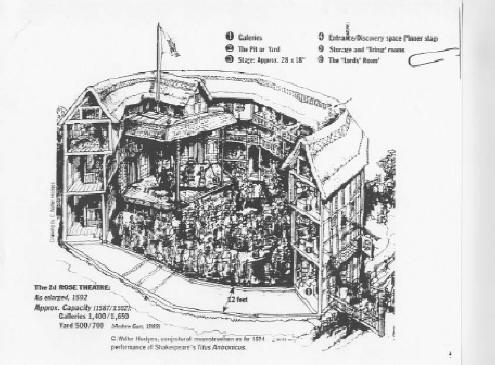 lays didn't run as long as we might suppose--perhaps only two or three times a week for a month (or occasion longer) or less--before they moved on to other material. Remember, Shakespeare wrote 37 plays, but the company of which he was a member, as both dramatist and actor (apparently, he specialized in the portrayal of older men), might need anywhere from 35 to 50 plays a year. That means that Richard Burbage, lead tragedian for the Chamberlain's Men and later King's Men (when James the IV of Scotland came down to England at the death of Elizabeth, he assumed the title of James I of England, becoming the patron of Shakespeare's acting company that heretofore had been patronized by the Lord Chamberlain--a true honor) had to keep nearly 50 roles in his head in any given year. This tells us something about the prodigious memories of these players, as well as their need for conventions and positioning analogies in order to help the quick learning of roles.